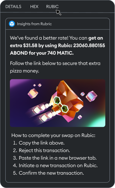 Discover the most efficient path for your crypto swap with Rubic’s $RBC AIRDROP. We actively sift through over 330+ DEXs in real-time, ensuring you get the best crypto exchange rates comparison. All seamlessly integrated and accessible within your MetaMask wallet. Enhance your trading with superior liquidity and smart route optimization.